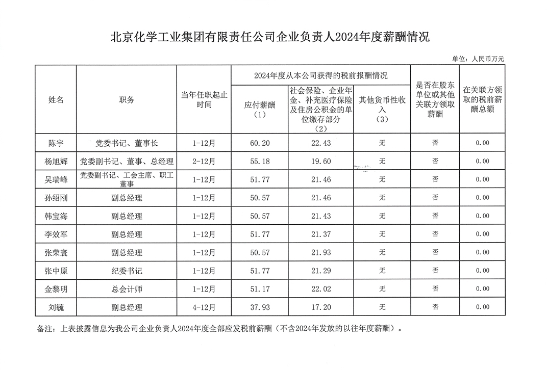 北京化学工业集团有限责任公司企业负责人2024年度薪酬情况
