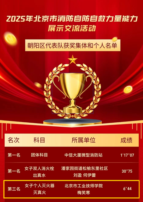 11月上旬,技师学院教师梅笑寒代表朝阳区参加北京市2025年消防自防自救力量能力展示交流活动,在“女子个人灭火器灭真火”项目中荣获北京市第三名。此次交流活动,来自全市20支代表队、600名消防安全重点单位、社区(村)自防自救力量队员同场竞技。